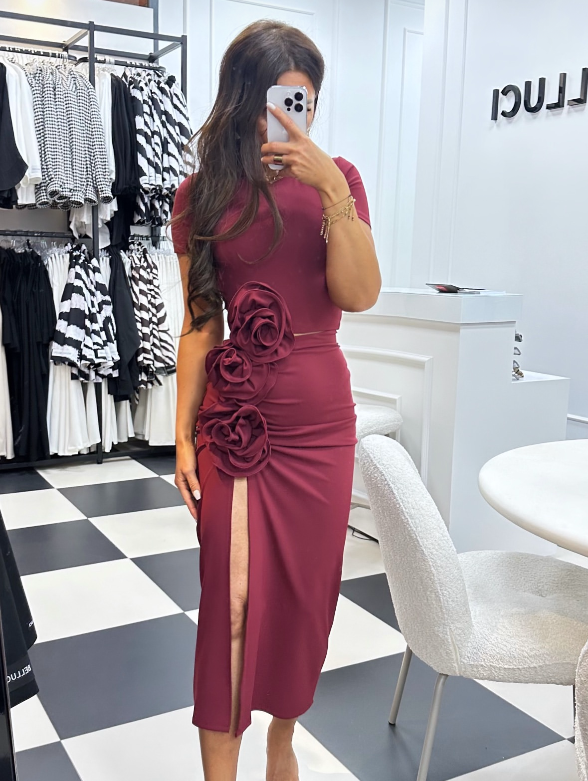 • Komplet damski - T-shirt o kroju crop i drapowana spódnica midi z przypinanymi kwiatami to idealne połączenie casualowego luzu