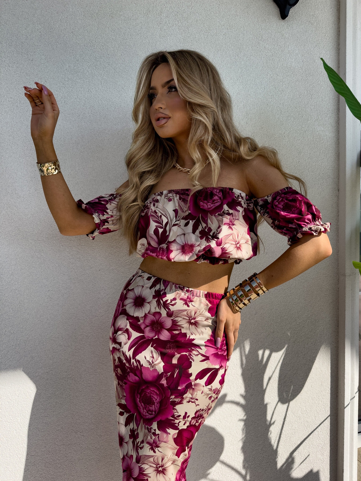 Komplet składający się z krótkiej bluzki hiszpanki oraz klasycznej spódnicy maxi to idealne połączenie elegancji i komfortu.