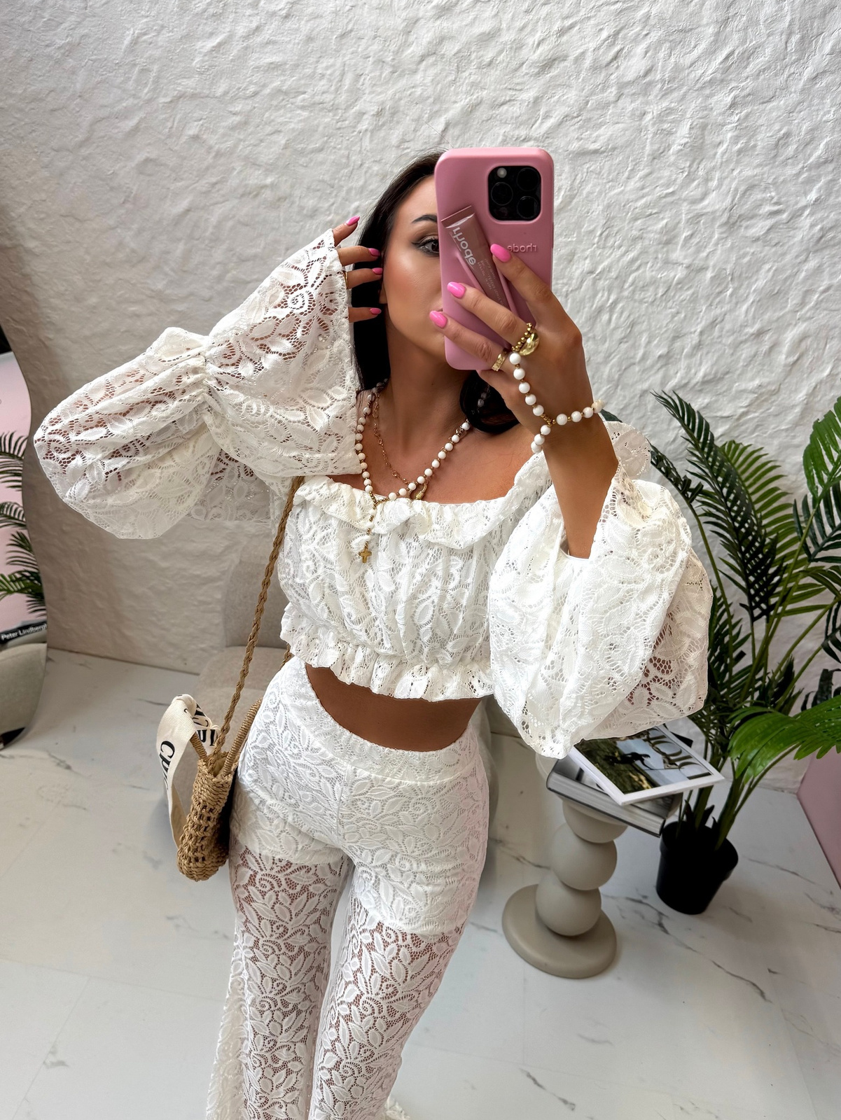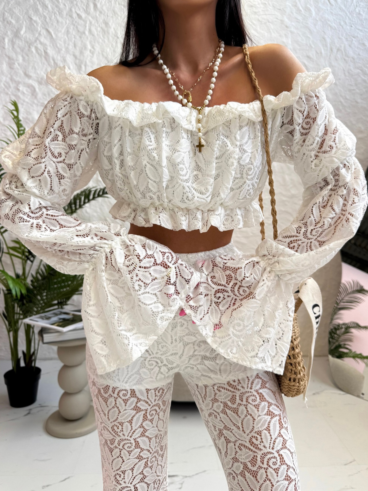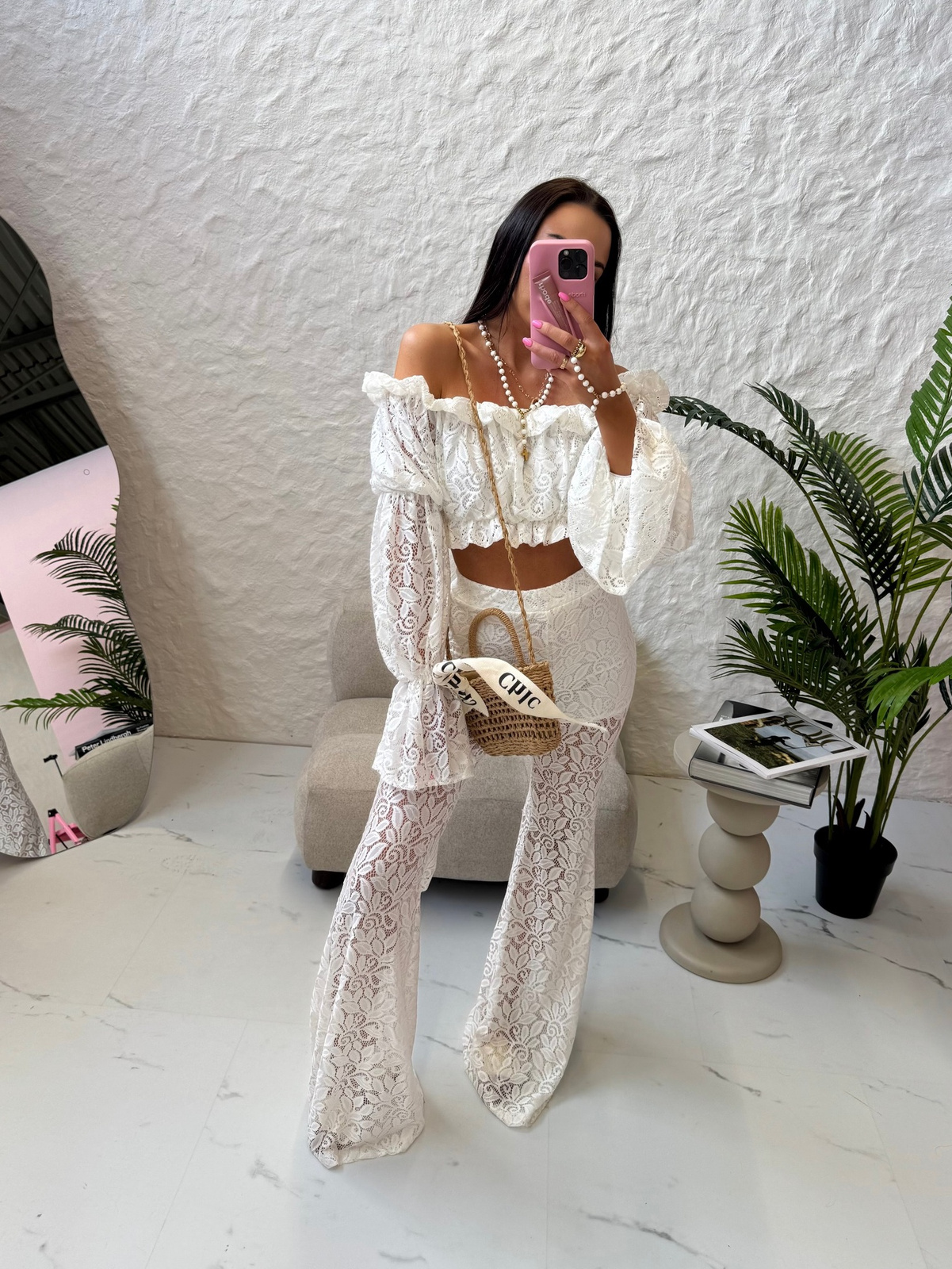 Letnie spodnie dzwony z koronki świetnie wyglądają zestawione z lekkim, zwiewnym topem lub bluzką na ramiączkach. Uzupełnij
