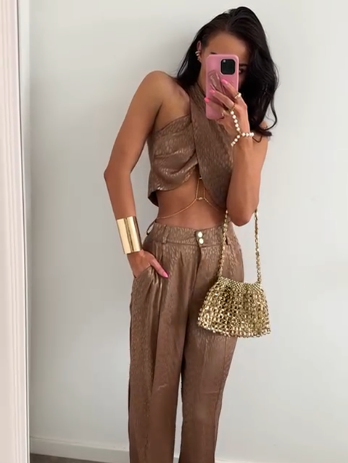 - Codzienny Look: Zestaw długich spodni z wiązanym topem z lekkimi klapkami lub sneakersami dla bardziej casualowego stylu. Dodaj do tego oversize’ową kurtkę, aby uzyskać modny, codzienny wygląd.