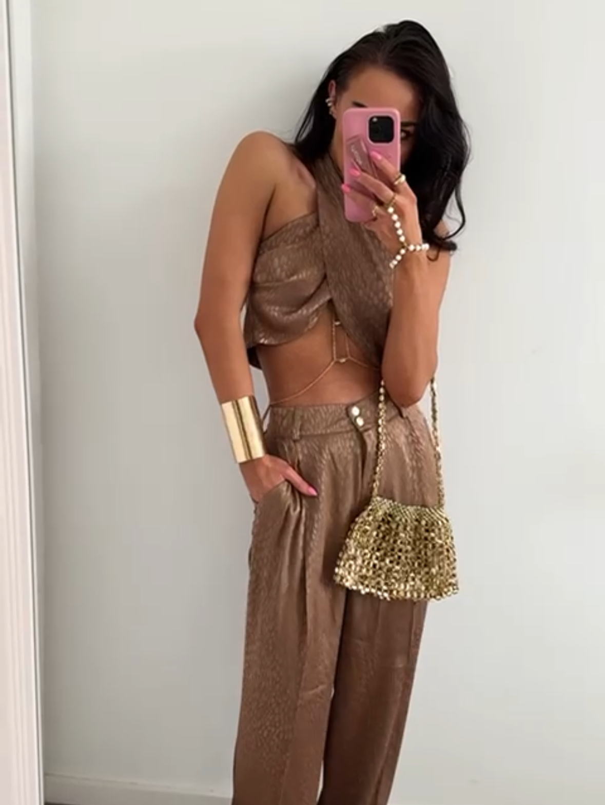 Ten satynowy komplet to idealne rozwiązanie na różne okazje – od eleganckich kolacji, przez przyjęcia, aż po codzienne wyjścia. Można go łatwo zestawić z odpowiednimi dodatkami, aby uzyskać look, który przyciągnie wzrok.