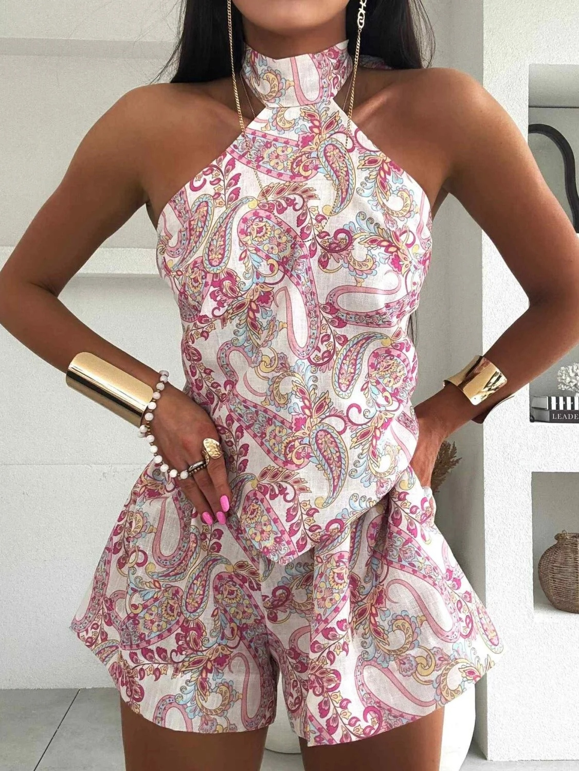 Komplet wakacyjny z wiskozy i lnu - top halter wiązany na plecach i krótkie spodenki - stylowo i wygodnie!