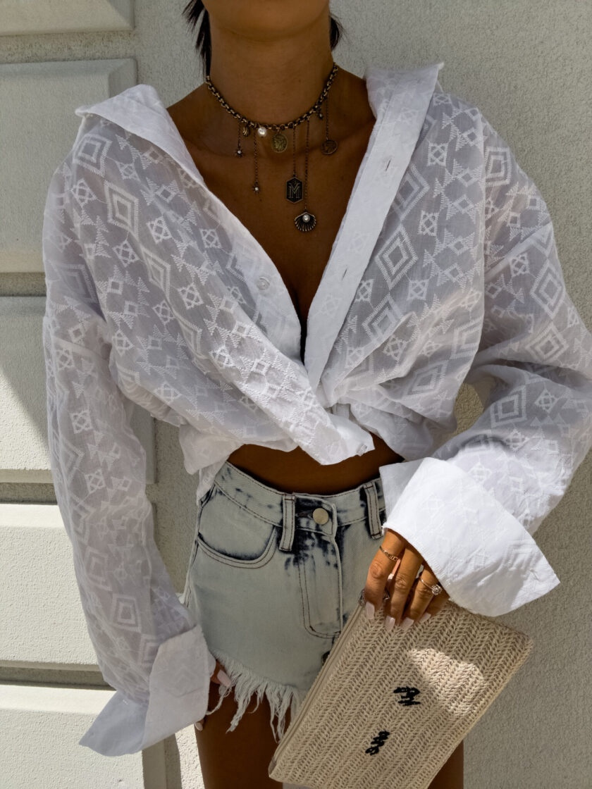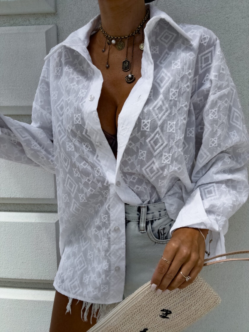 - Odkryj naszą białą bawełnianą koszulę damską w delikatne geometryczne wzory, która łączy w sobie klasykę z nowoczesnym stylem. To must-have w garderobie każdej kobiety, która pragnie emanować elegancją i pewnością siebie, niezależnie od okazji.