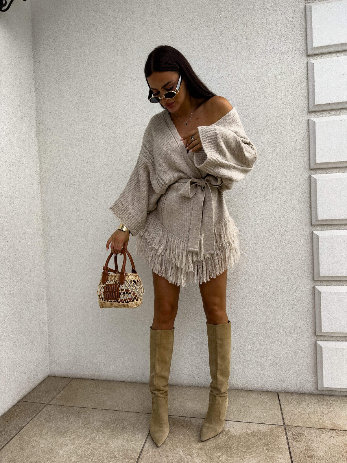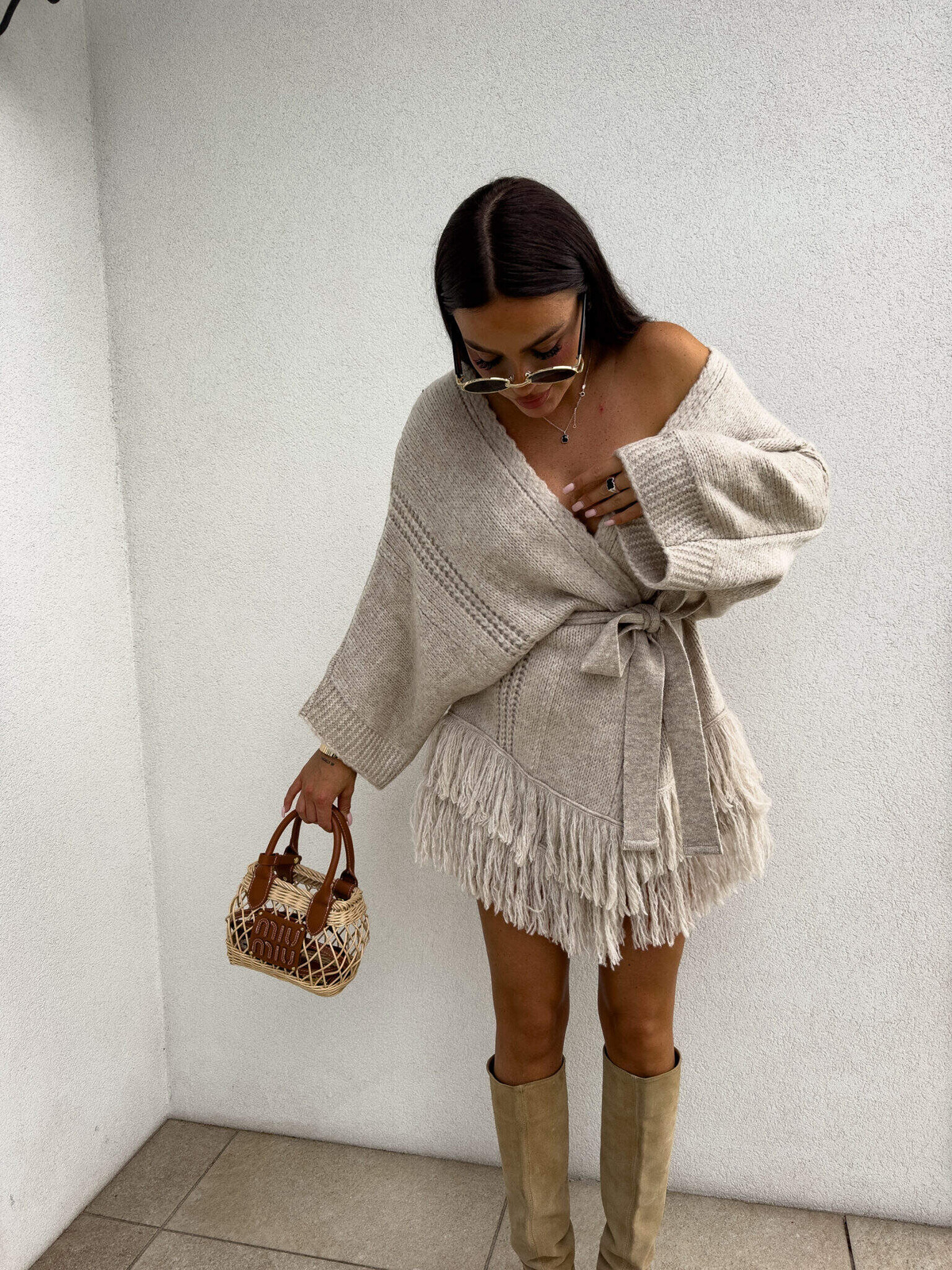 - Podkreśl swój styl z kardiganem Boso. Kardigan ma luźny, otwarty fason, a talię można podkreślić dołączonym paskiem, dzięki czemu sylwetka nabiera kobiecego kształtu. Dół kardiganu ozdobiony frędzlami, które nadają mu lekkości i boho charakteru.